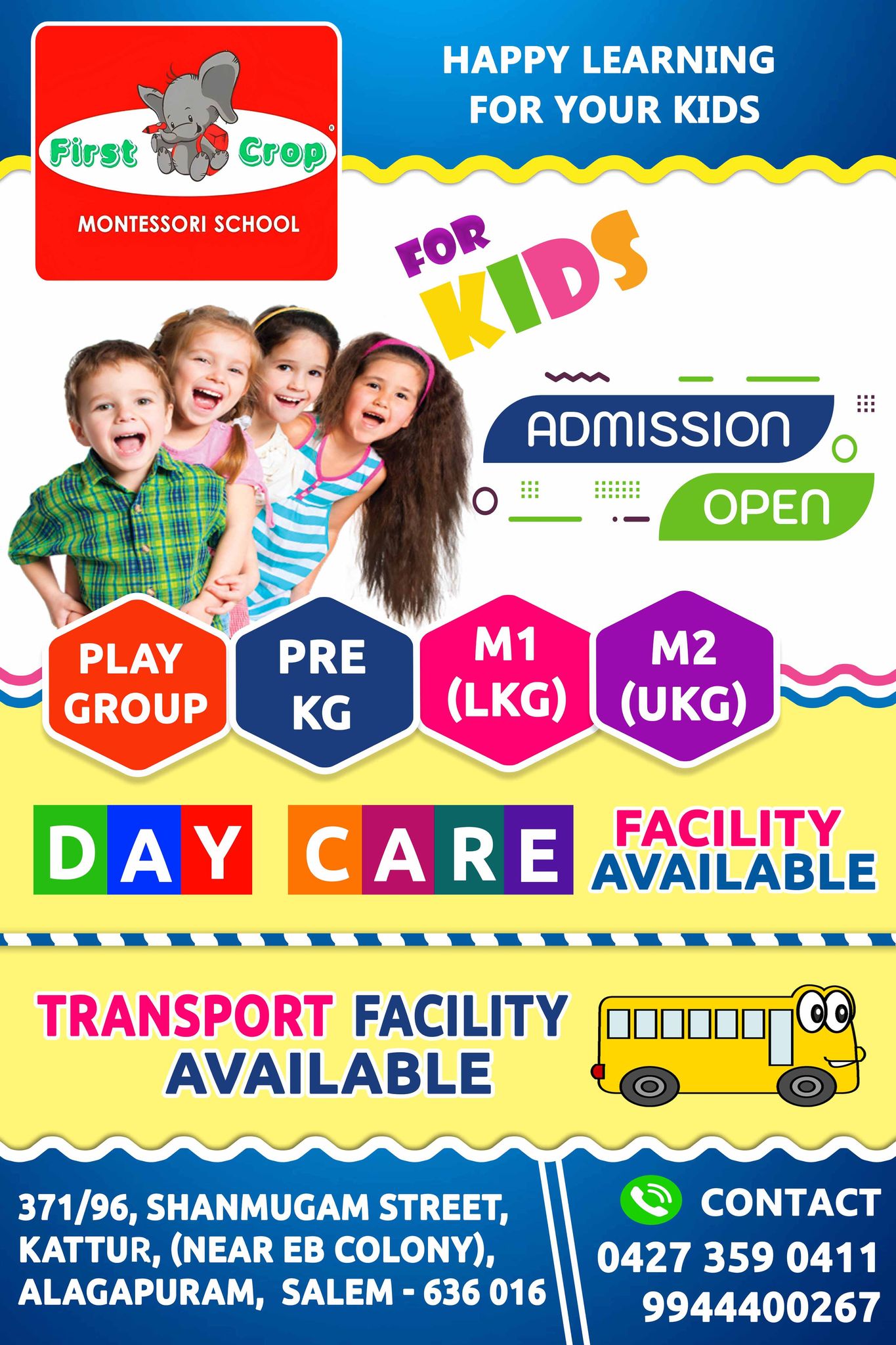 Heartly welcome to First crop Montessori school. Education is the most important to every child, First crop is a quality Montessori school in Salem. Montessori education has entirely different approach is based on self directed activity, and children want the same thing that we want to be confident to face the world. Learning fun, When children play they feel great and happier and their creativity made a magic. Children should face the world with bold and confidence. Here we have highly professional teachers to train our kids. Every child has some great talent, we just make them true in his own way. Our teaching process that help to face the world with confidents and ready for imagination, concentation, self confidence, social skills and everyday challenges. Our school has spacious classrooms, highly professional teachers, social skills with extra curricular activities. Child can learn each good things in our school they feel much enjoyed and knowledgeable in everyday.